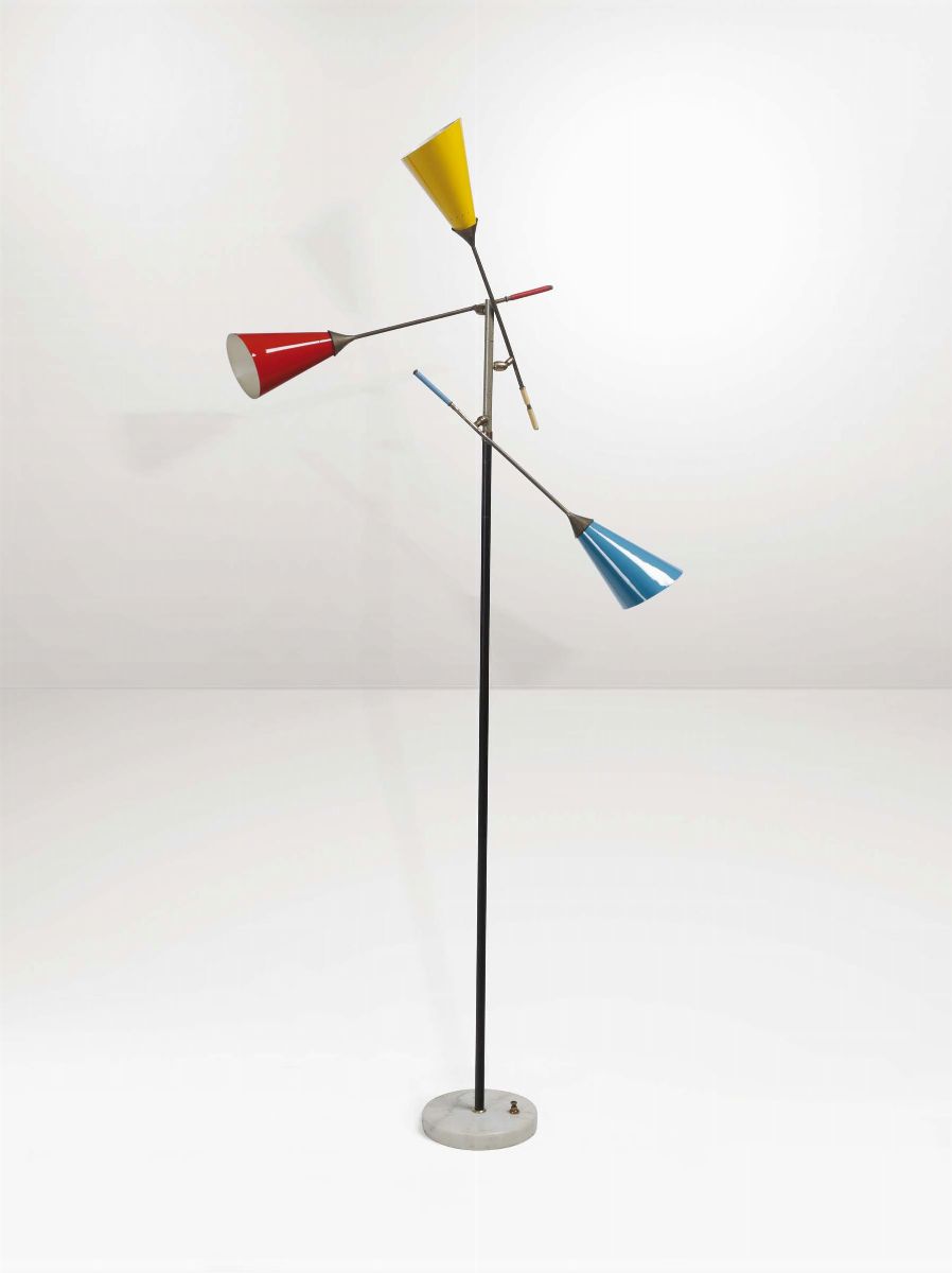 Lampada da terra con struttura in ottone, base in marmo e diffusori in alluminio verniciato orientabili.