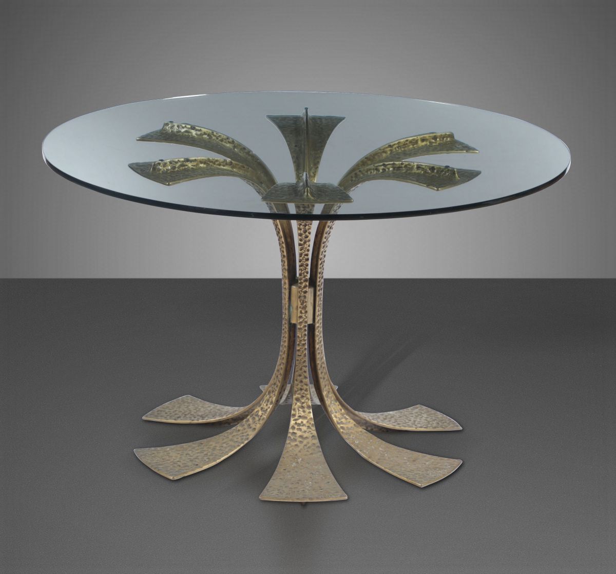 Tavolo con struttura in bronzo martellato e piano in vetro.