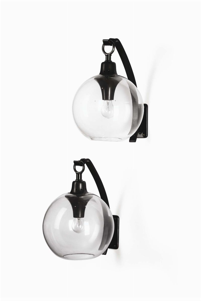 Coppia di appliques con struttura in ferro brunito e diffusore in vetro.