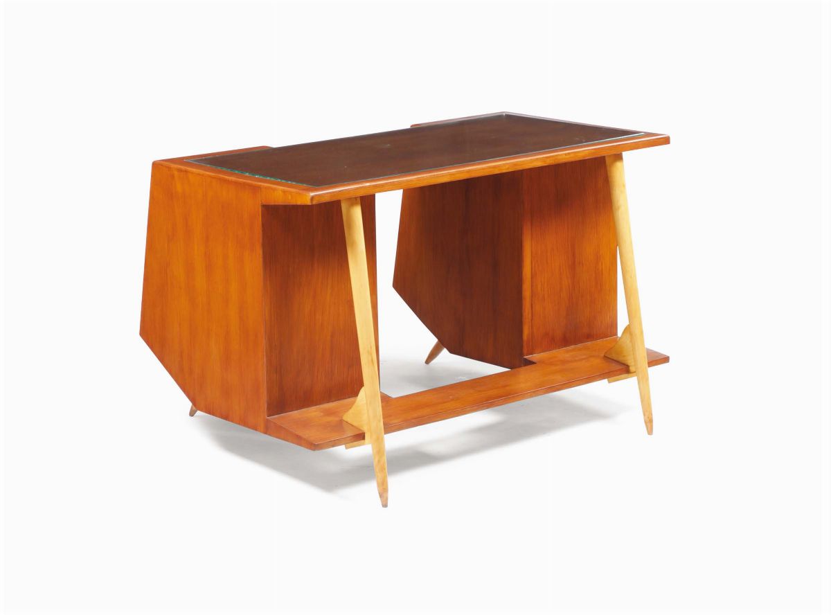 Scrivania con struttura in legno di faggio e di acero. Piano in vetro.