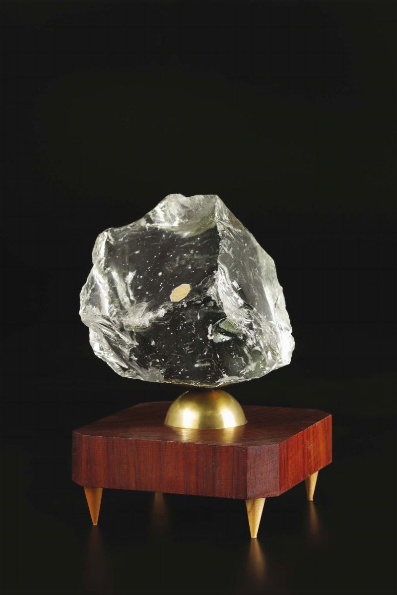 Scultura in vetro con supporto in ottone e legno. Etichetta originale.