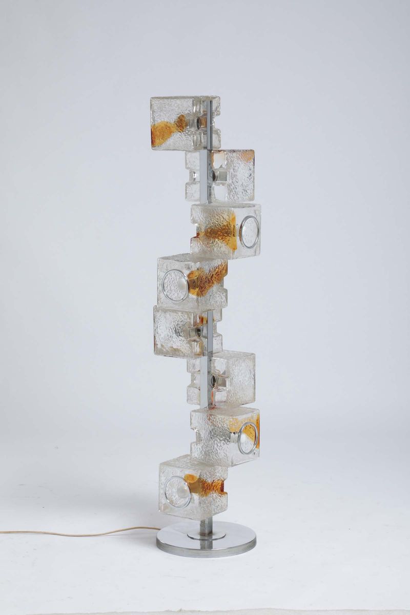 Lampada da terra con struttura in metallo cromato ed elementi diffusori in vetro di Murano.