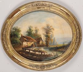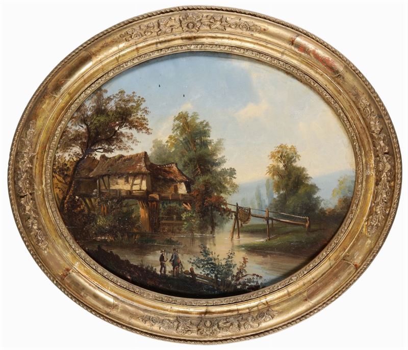 coppia di dipinti ad olio su tavoletta, cm 36x45