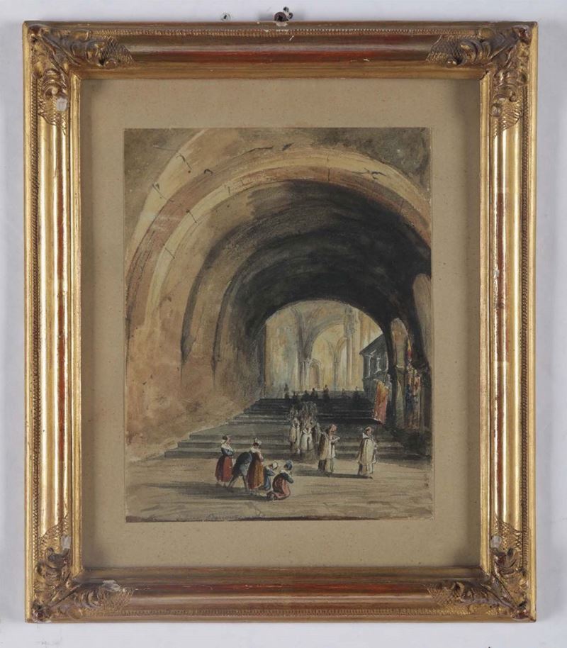 Pittore del XIX secolo Interno di cattedrale con processione Paesaggio con cascata
