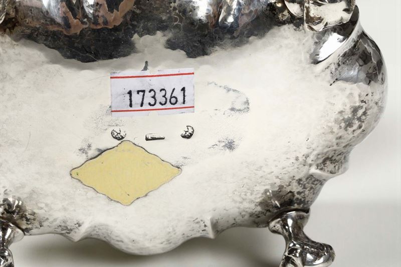 Corpo ovale cesellato con coperchio incernierato, poggiante su piedini ferini