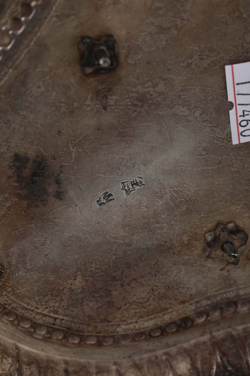 A cruet holder in molten, embossed and chiselled silver with ground glass cruets. Stamps imitating 18th century silver art, [..]