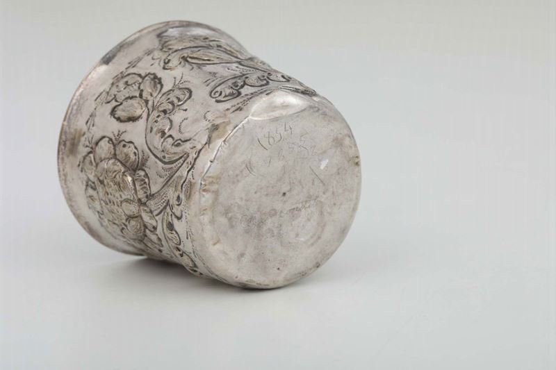 A glass in embossed and chiselled silver with floral motives. Germany? 16th-17th century, apparently free of stamps