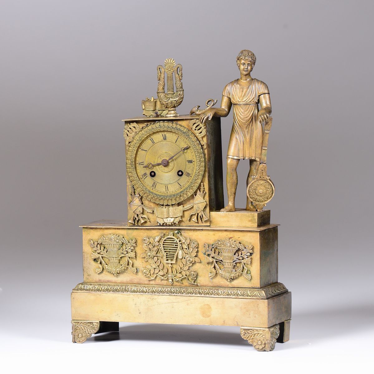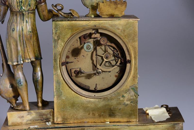decori con strumenti musucali e figura maschile a tuttotondo a fianco del quadrante con numerazione romana in nero per le ore.