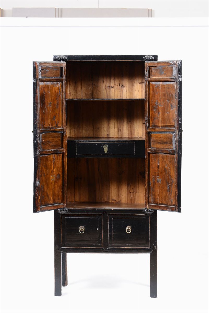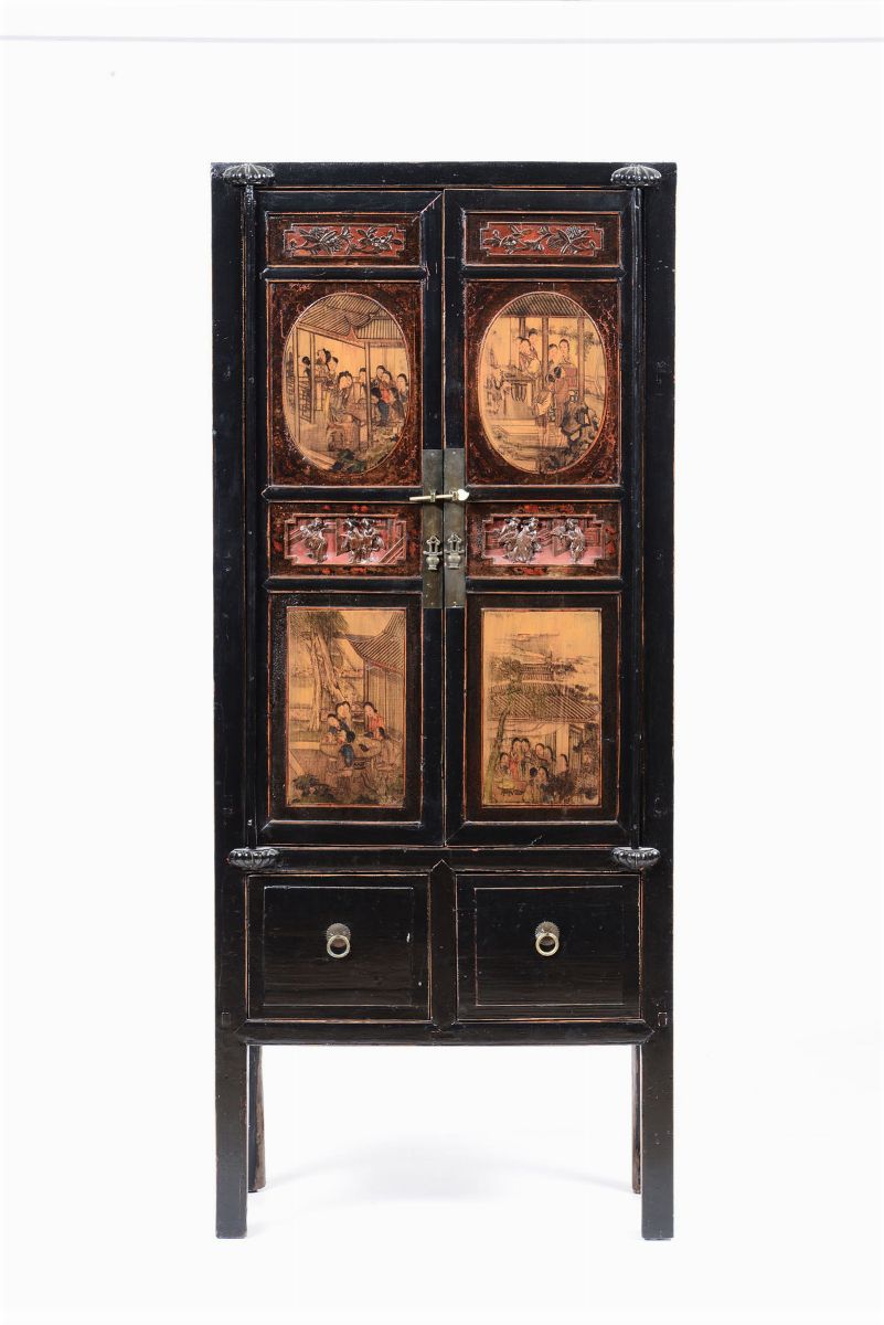 Armadietto a due ante in legno ebanizzato e dipinto, Cina? XX secolo