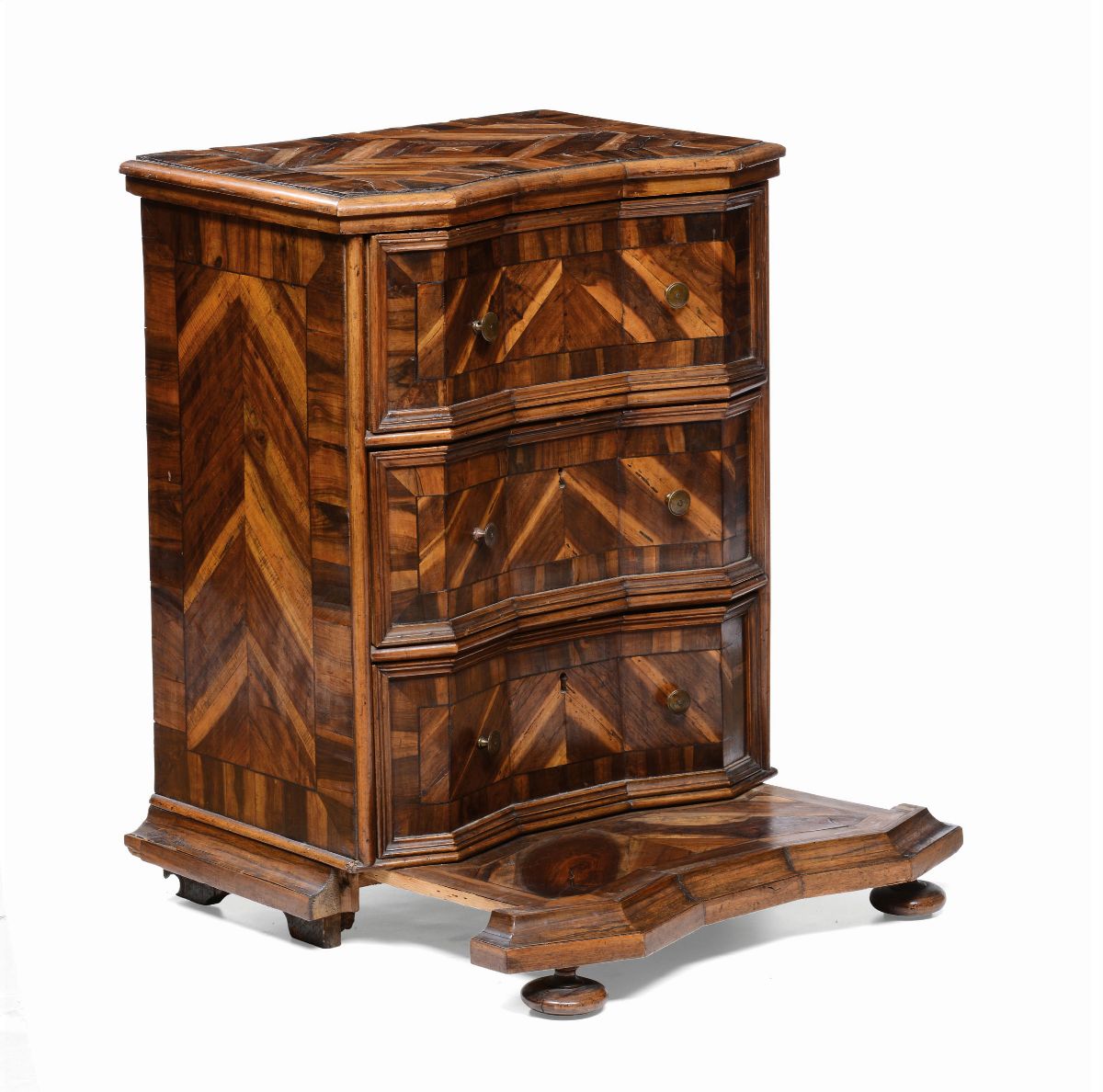 Comodino inginocchiatoio impiallacciato in legni vari, XIX secolo