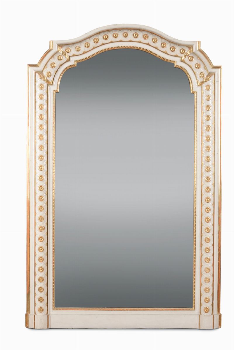 gambe a voluta a ricciolo intagliate con elementi fogliacei riunite da crociera centrata da vasetto, piano in marmo bianco, cm 134x47x286, specchiera cm 194x125 (difetti)