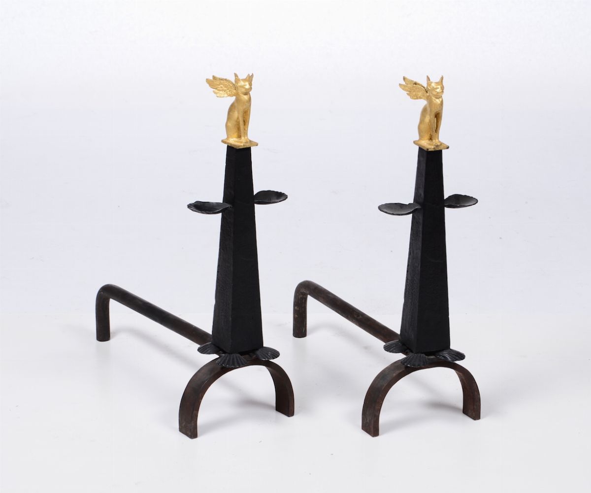 Coppia di alari in metallo e bronzo dorato, XIX secolo
