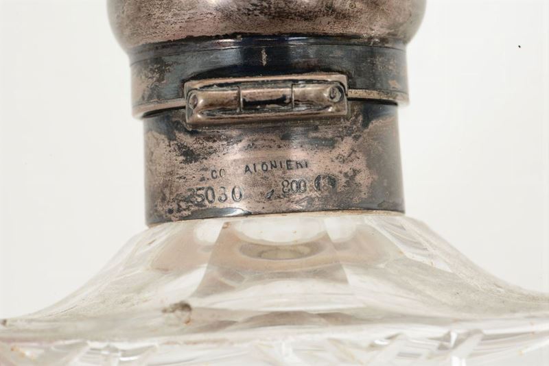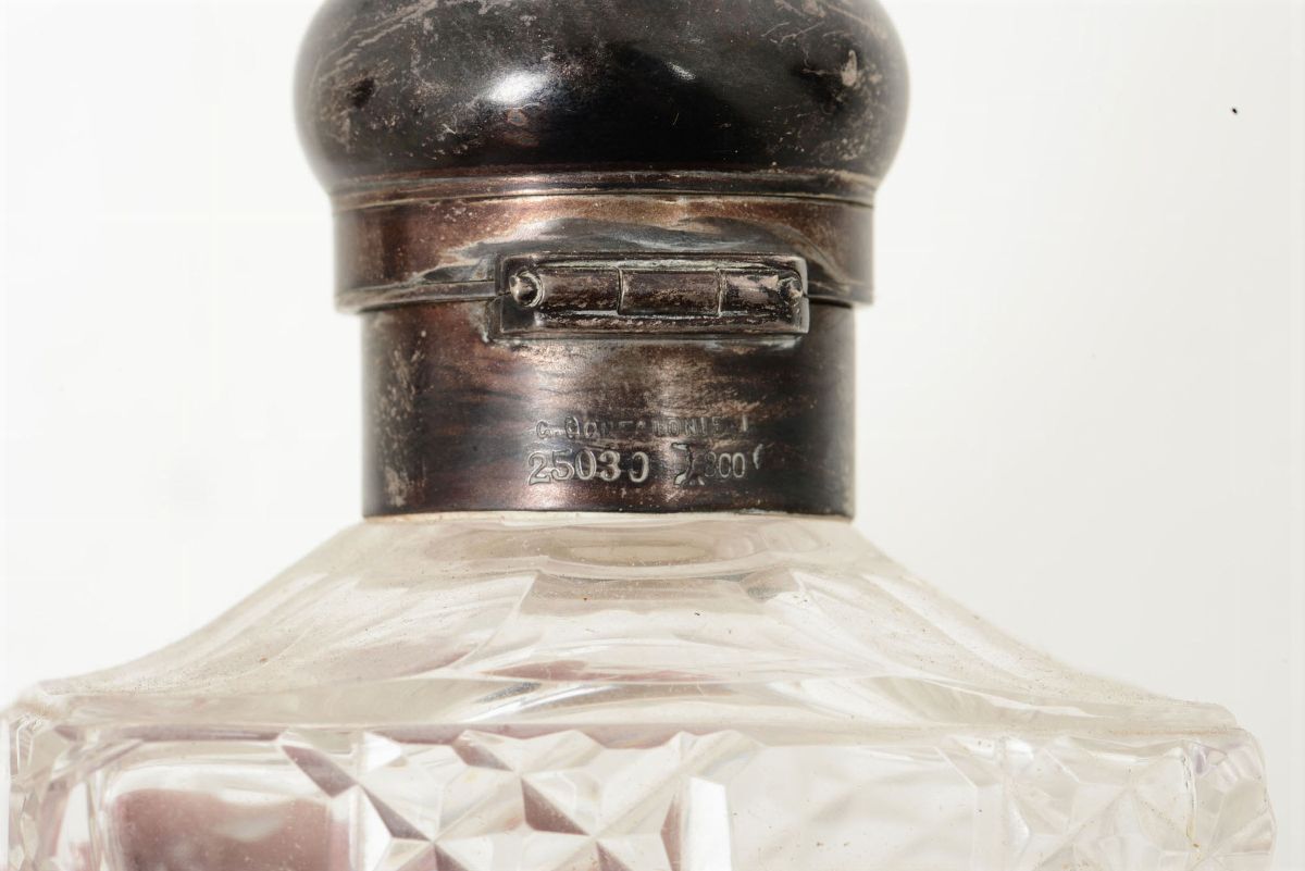 Coppia di bottiglie in cristallo molato con tappo in argento