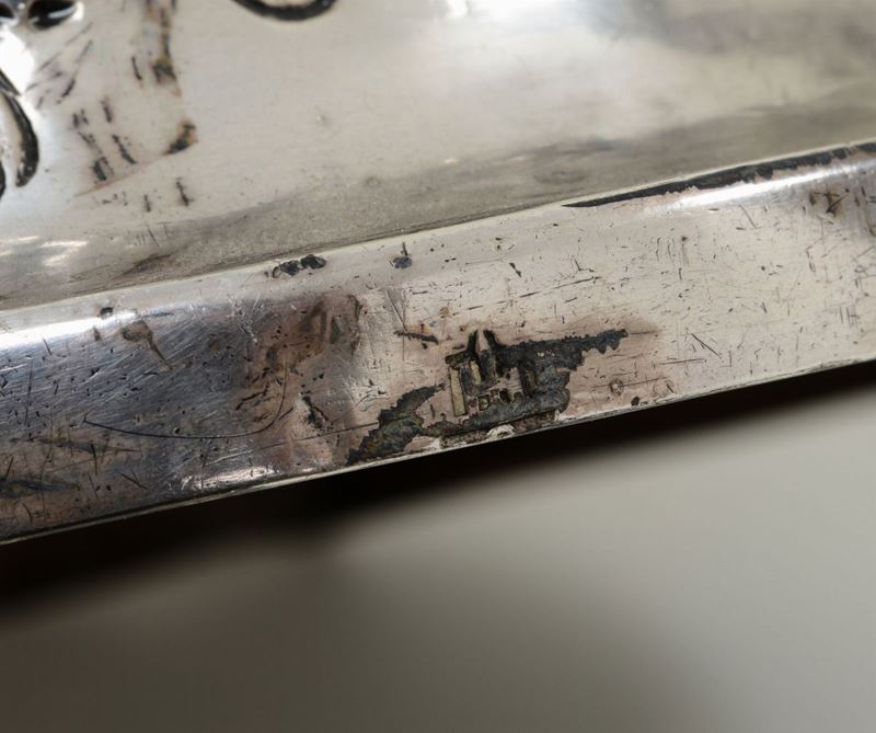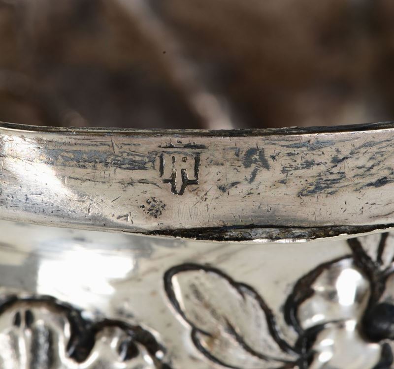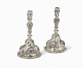 Coppia di candelieri in argento sbalzato e cesellato, punzone della Torretta con datario non leggibile. Genova probabile [..]