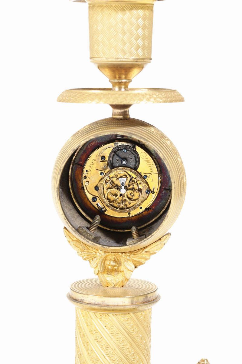 Coppia di candelieri (uno montato a lume) e un orologio in bronzo. Francia, epoca Carlo X