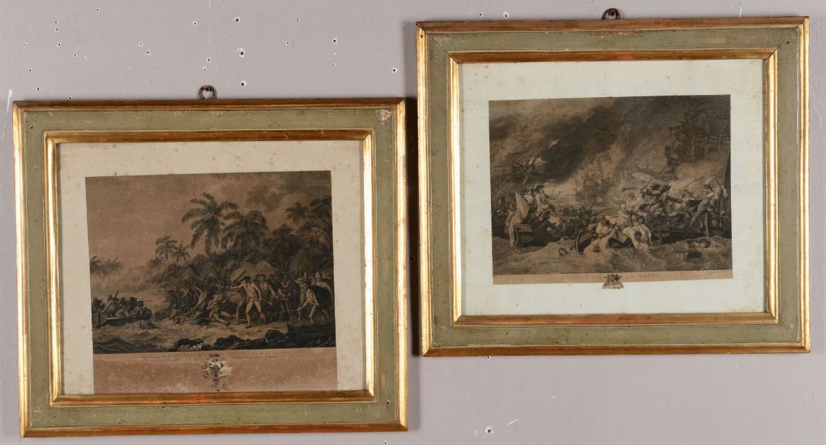 Coppia di cornici laccate verde e oro contenenti stampe, fine XIX secolo