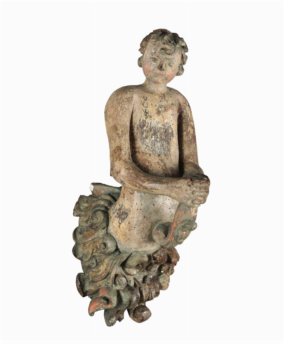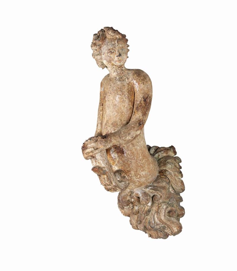 Coppia di figure maschili reggilume in legno intagliato e policromo, XVIII secolo
