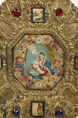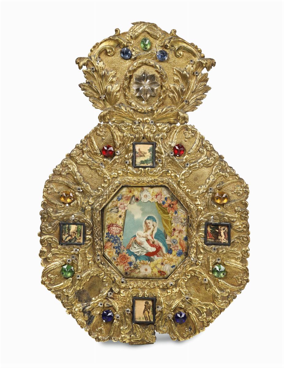 Cornice in rame dorato e sbalzato contenente immagine della Vergine