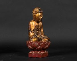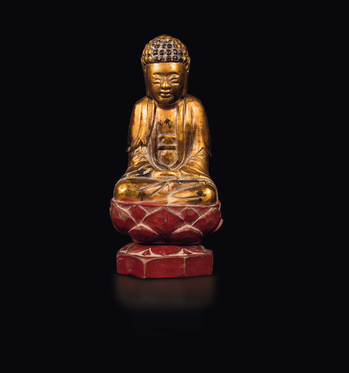 Figura di Amitayus seduto su loto in legno laccato e dorato, Cina, XIX secolo