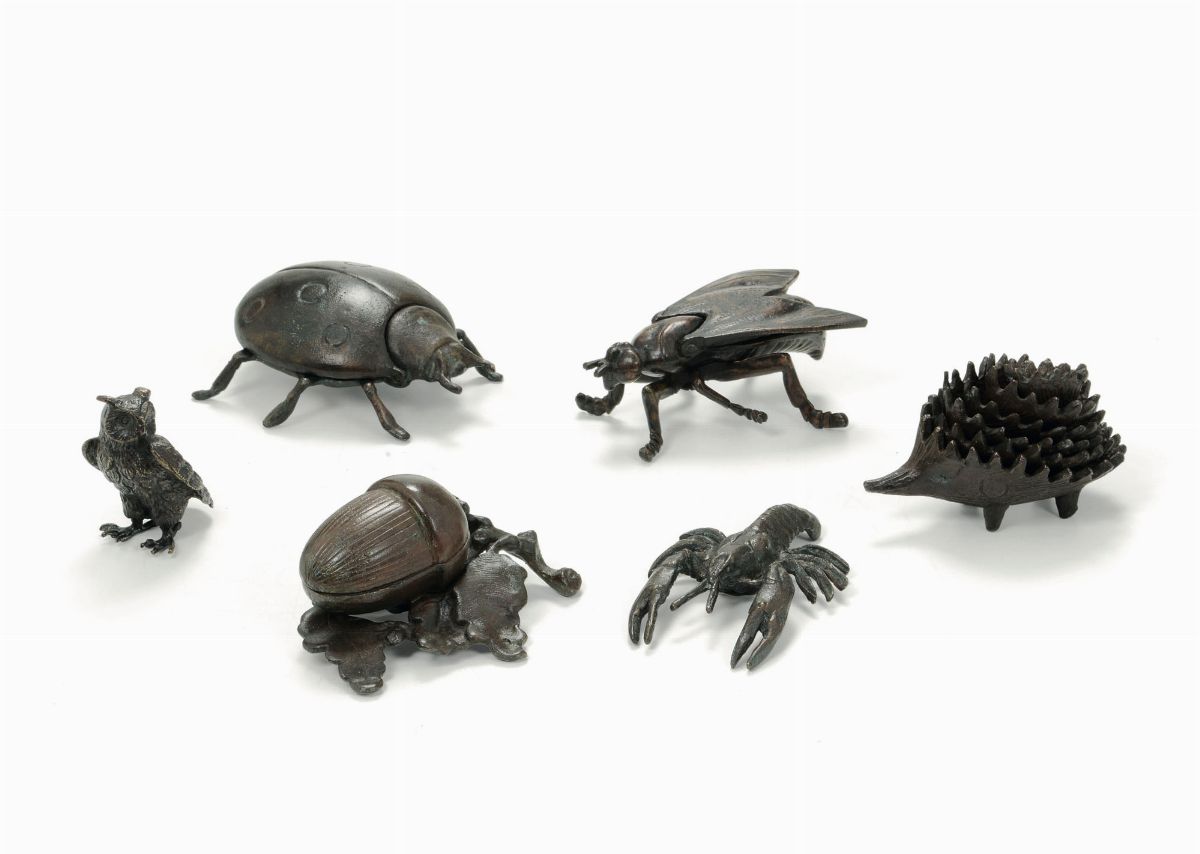Gruppo di cinque animali in bronzo ed una ghianda. Varie epoche