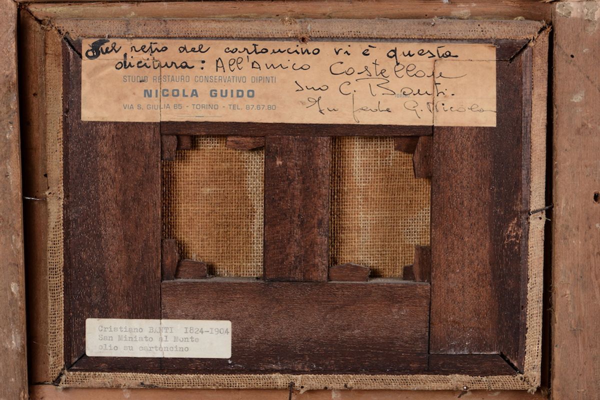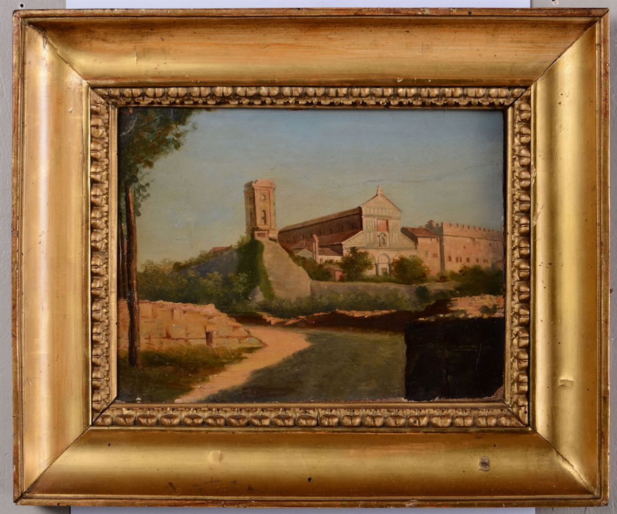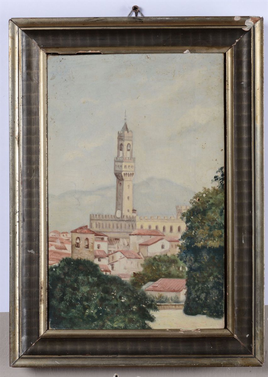 Lotto di due quadretti uno su tela ed uno su cartoncino raffiguranti castello e architetture