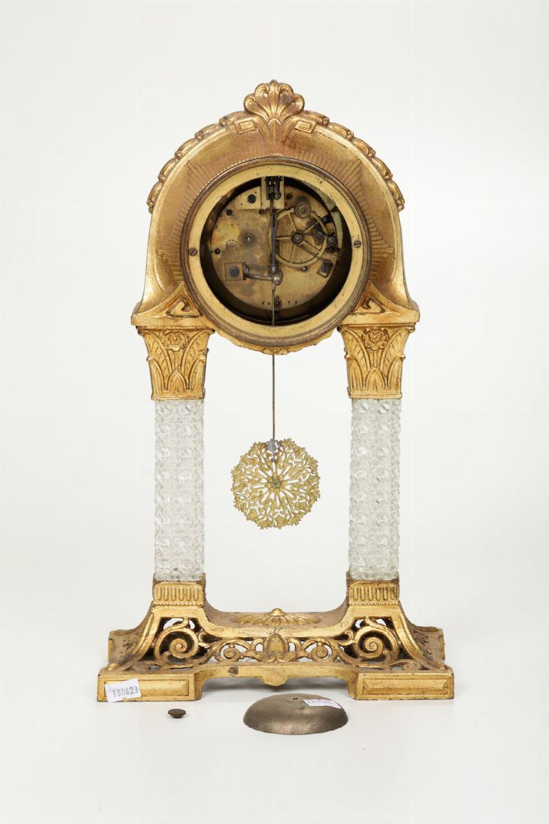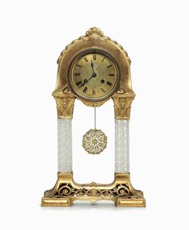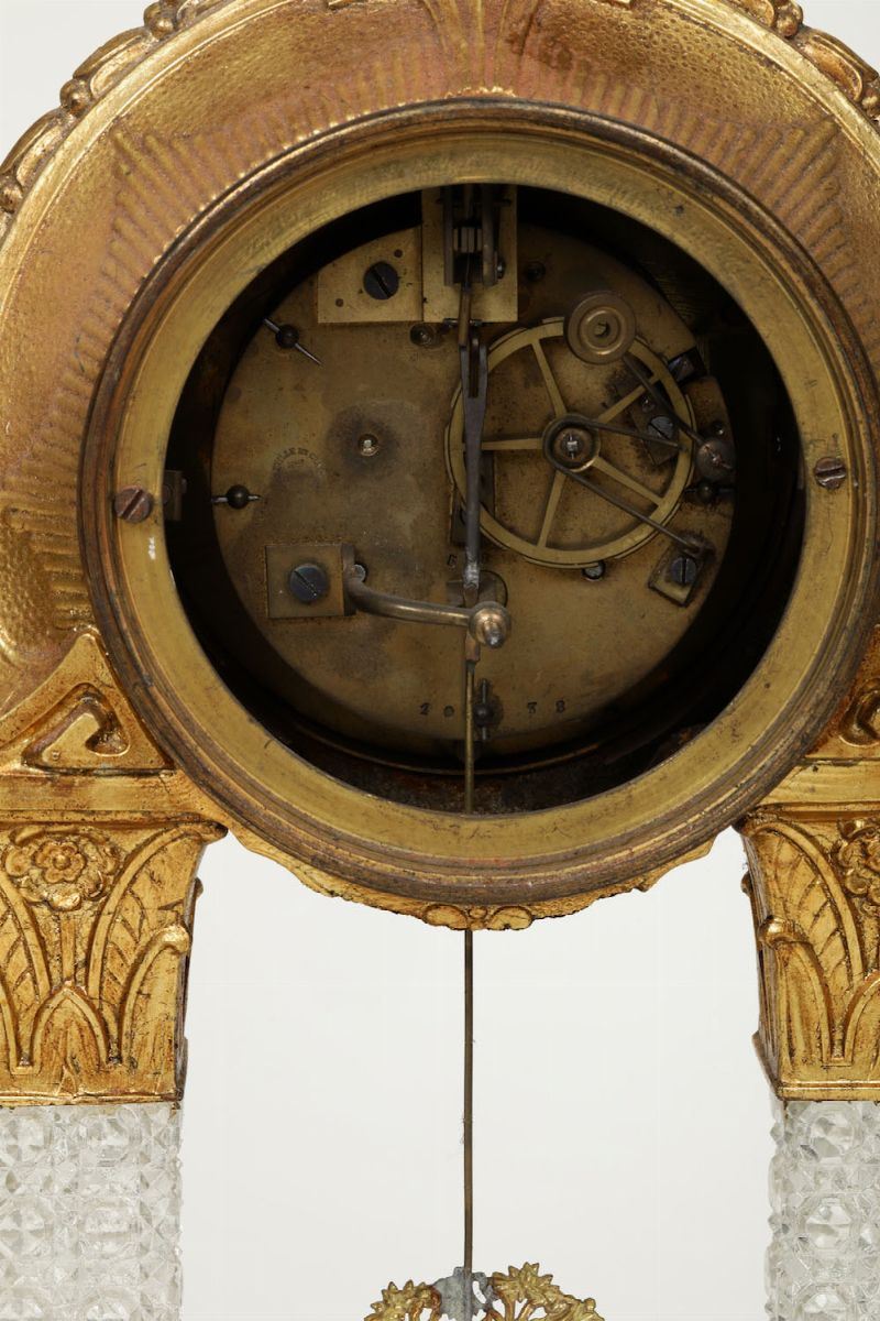 Pendola da tavolo a portico in bronzo dorato con colonne in cristallo, XIX-XX secolo