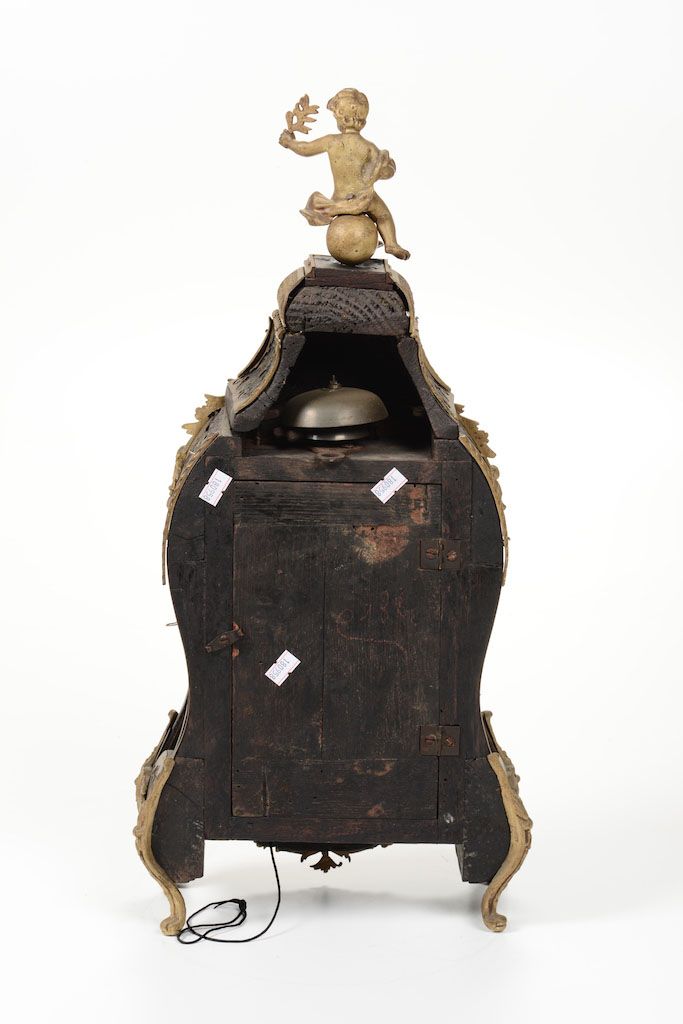 Cassa sagomata con ricche applicazioni di bronzi dorati, sormontata da putto, quadrante in ottone con numeri romani in blu su smalto bianco, cm 26x12x55