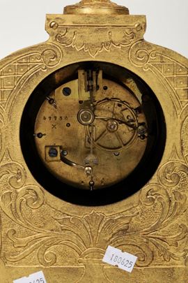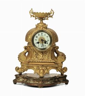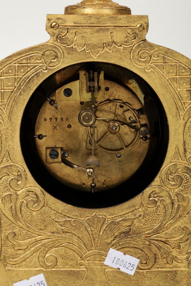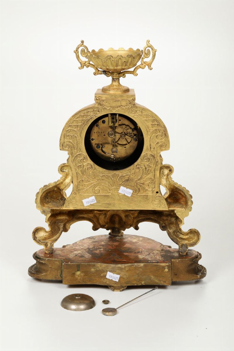 Pendola da tavolo in bronzo dorato con base in legno, Francia, Lyon, fine XIX secolo