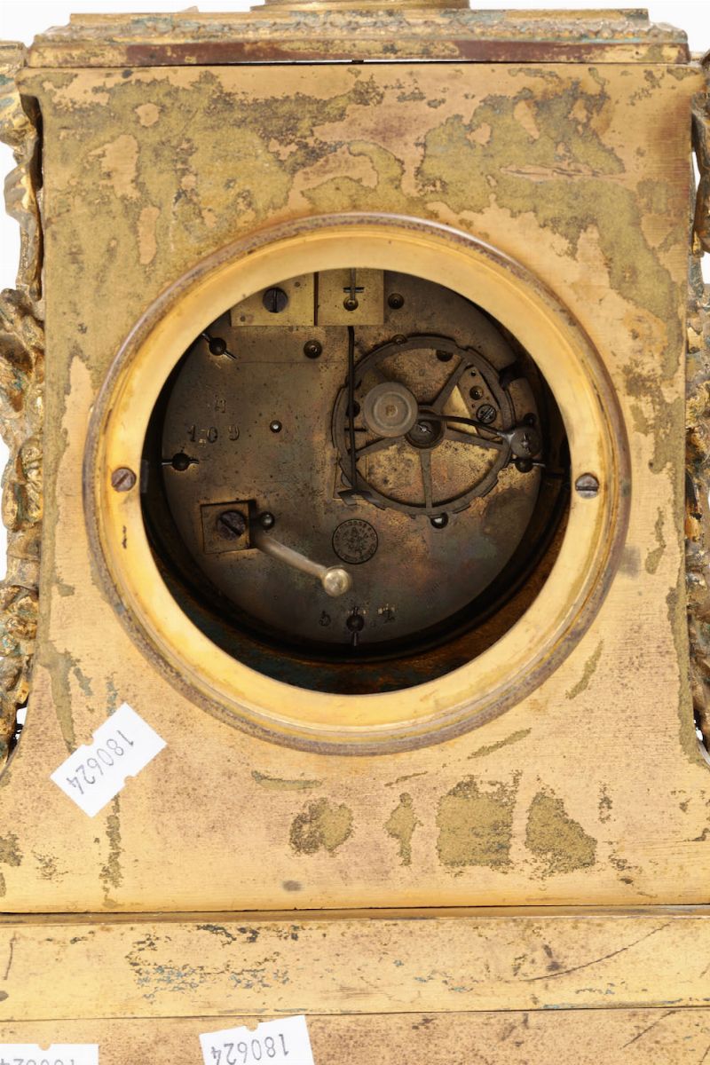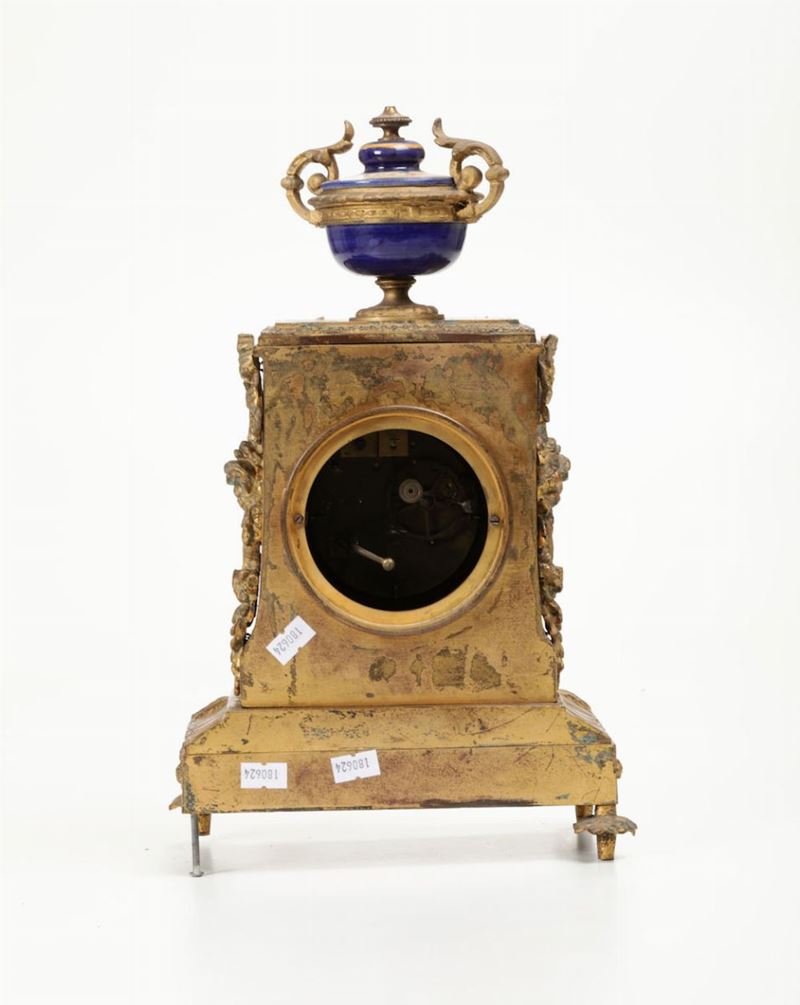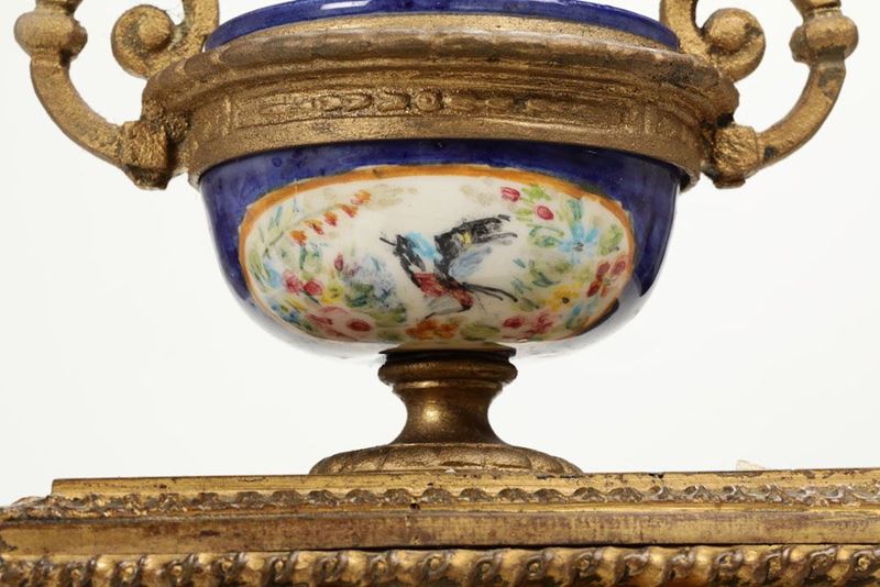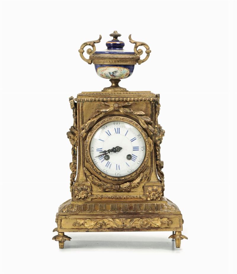Pendola da tavolo in bronzo dorato con vasetto in porcellana sulla sommità, fine XIX secolo