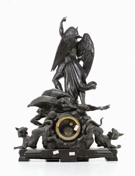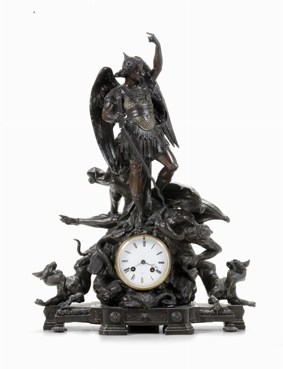 Pendola da tavolo in metallo brunito con Arcangelo Michele, XIX-XX secolo
