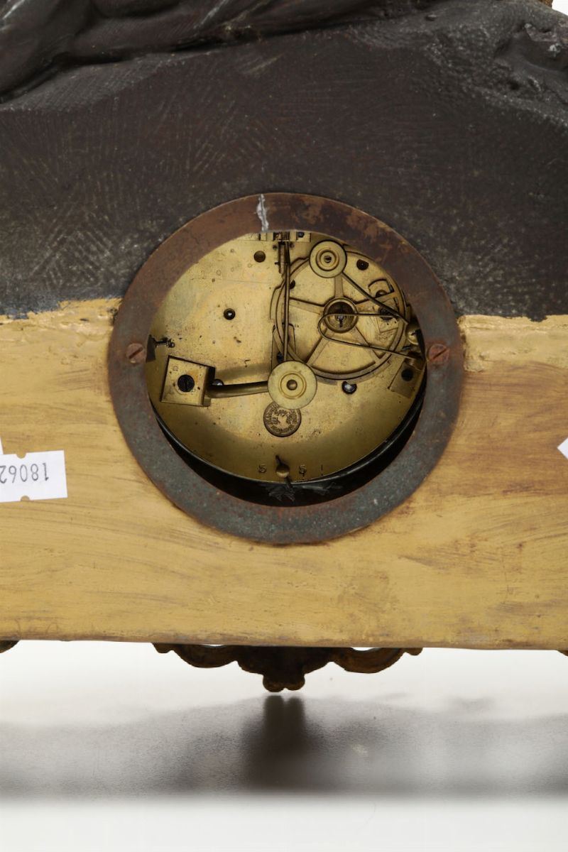Pendola da tavolo in metallo dorato e brunito, fine XIX secolo