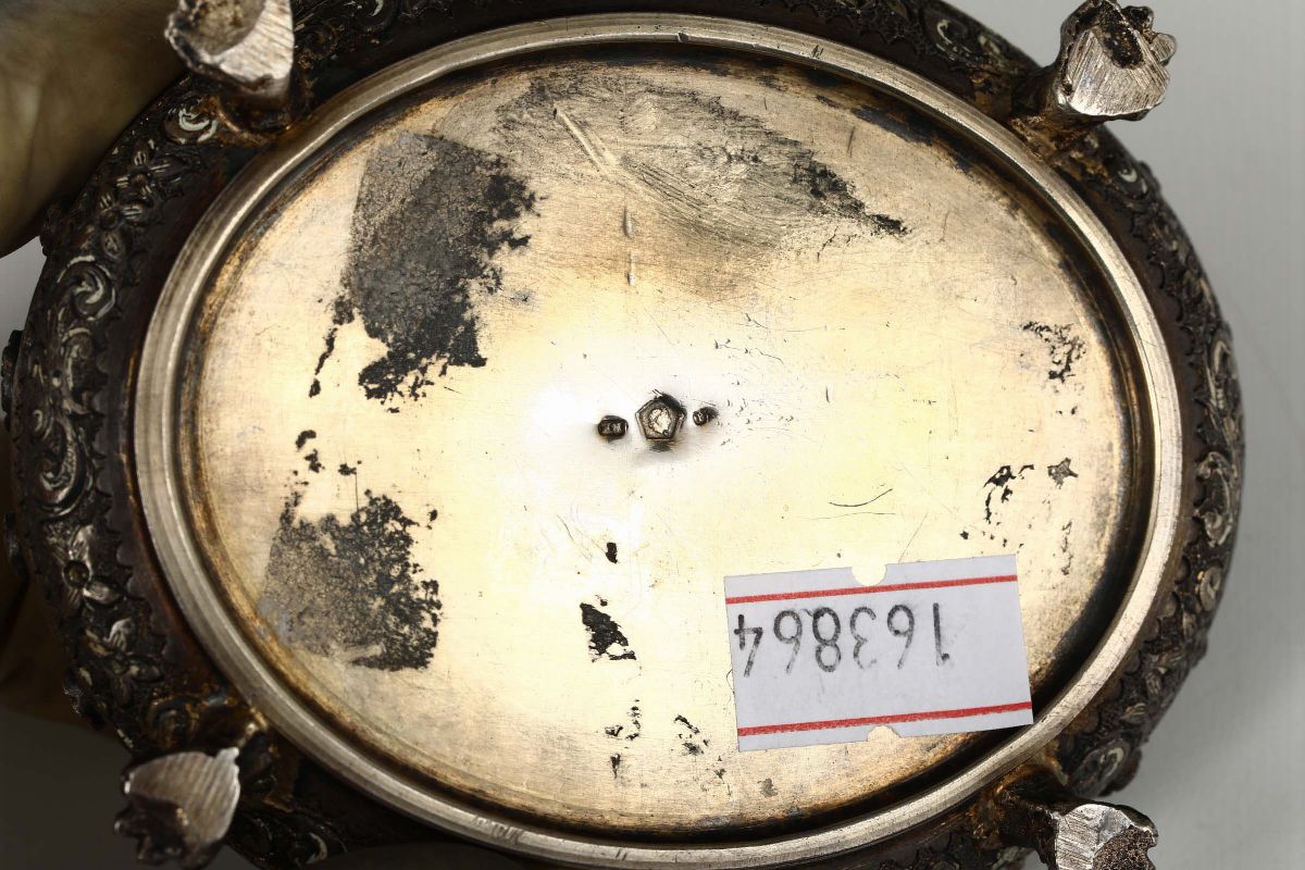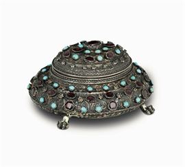corpo ovoidale schiacciato poggiante su piedi ferini con incastonati granati e turchesi. Decori floreali incisi ed applicati