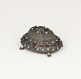 Scrigno in argento fuso, sbalzato, cesellato, dorato, turchesi e granati, Impero austro-ungarico, città di Pest bolli in uso dal 1867 al 1921