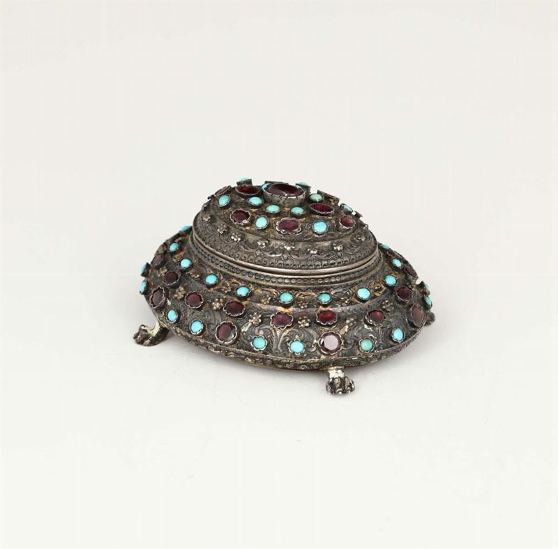 Scrigno in argento fuso, sbalzato, cesellato, dorato, turchesi e granati, Impero austro-ungarico, città di Pest bolli in [..]