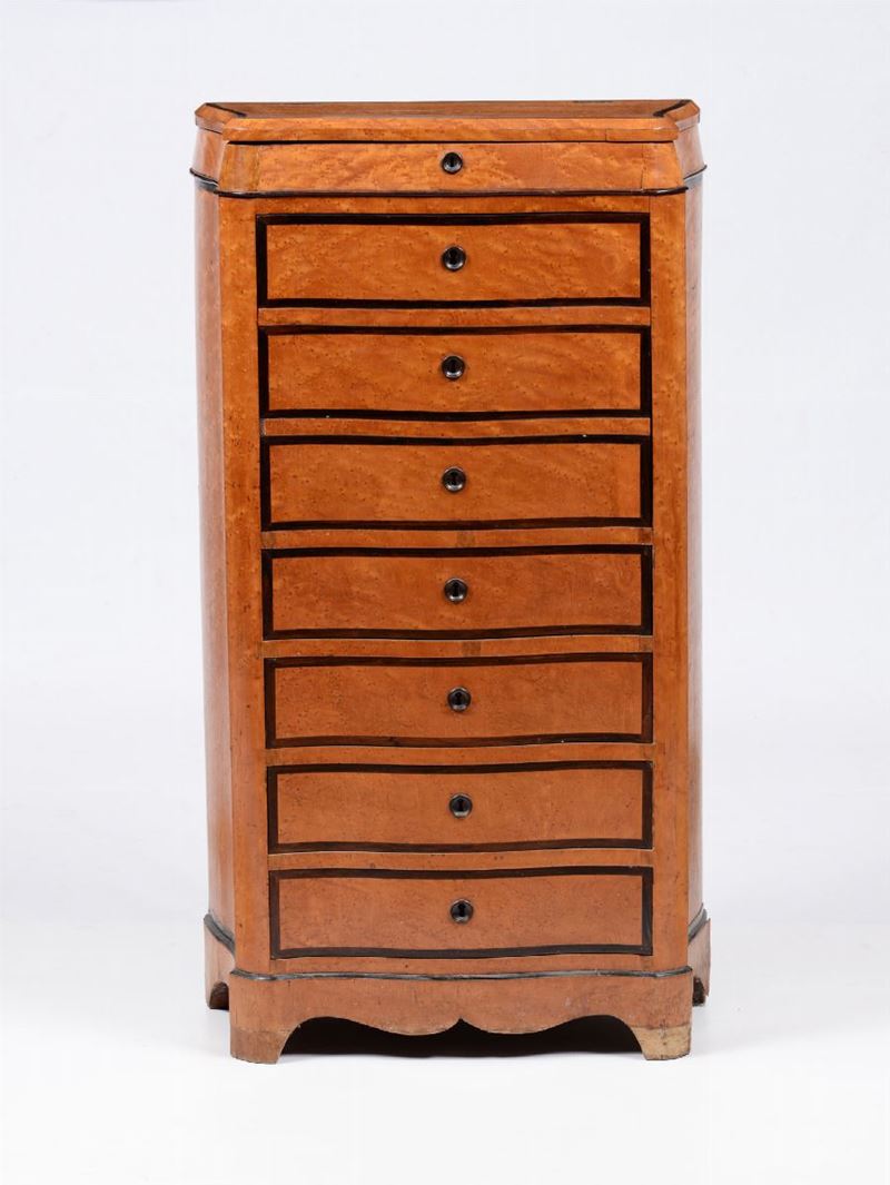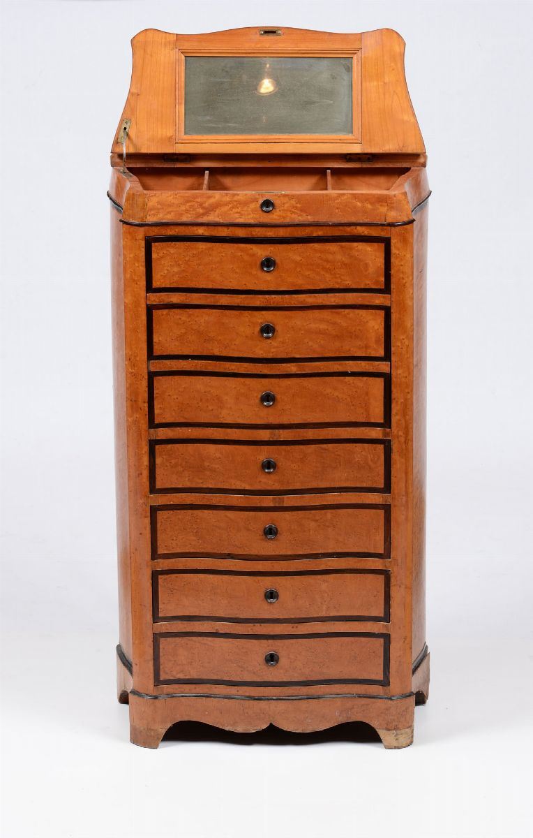 fronte e fianchi mossi, quattro cassetti alla base e calatoia sovrastante decorata a finti cassetti, cm 63x30x117
