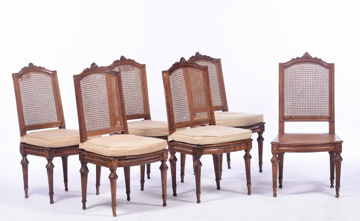 Sei sedie in stile Luigi XV in noce, XIX secolo