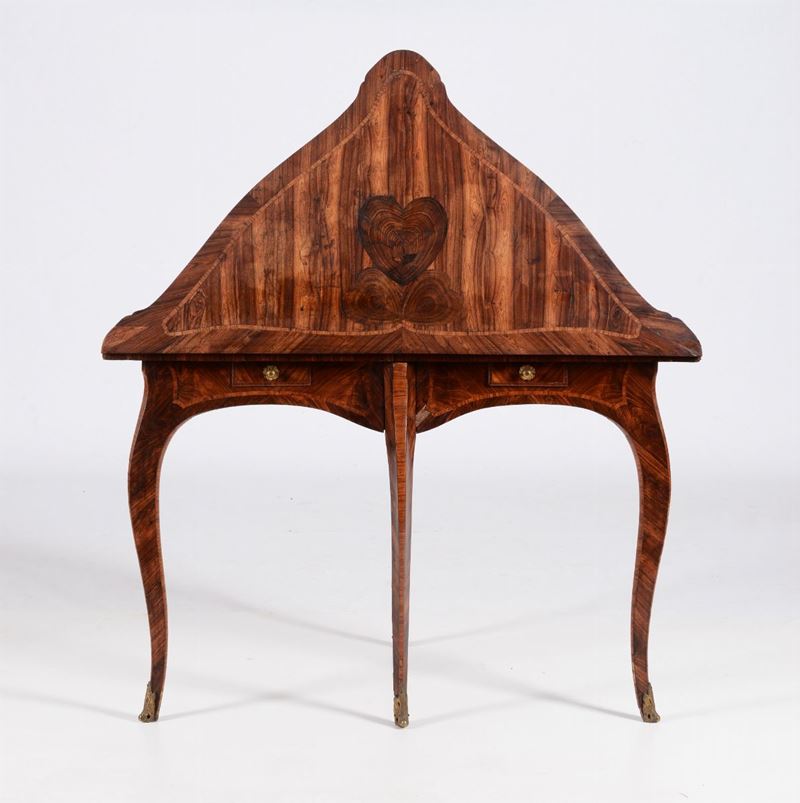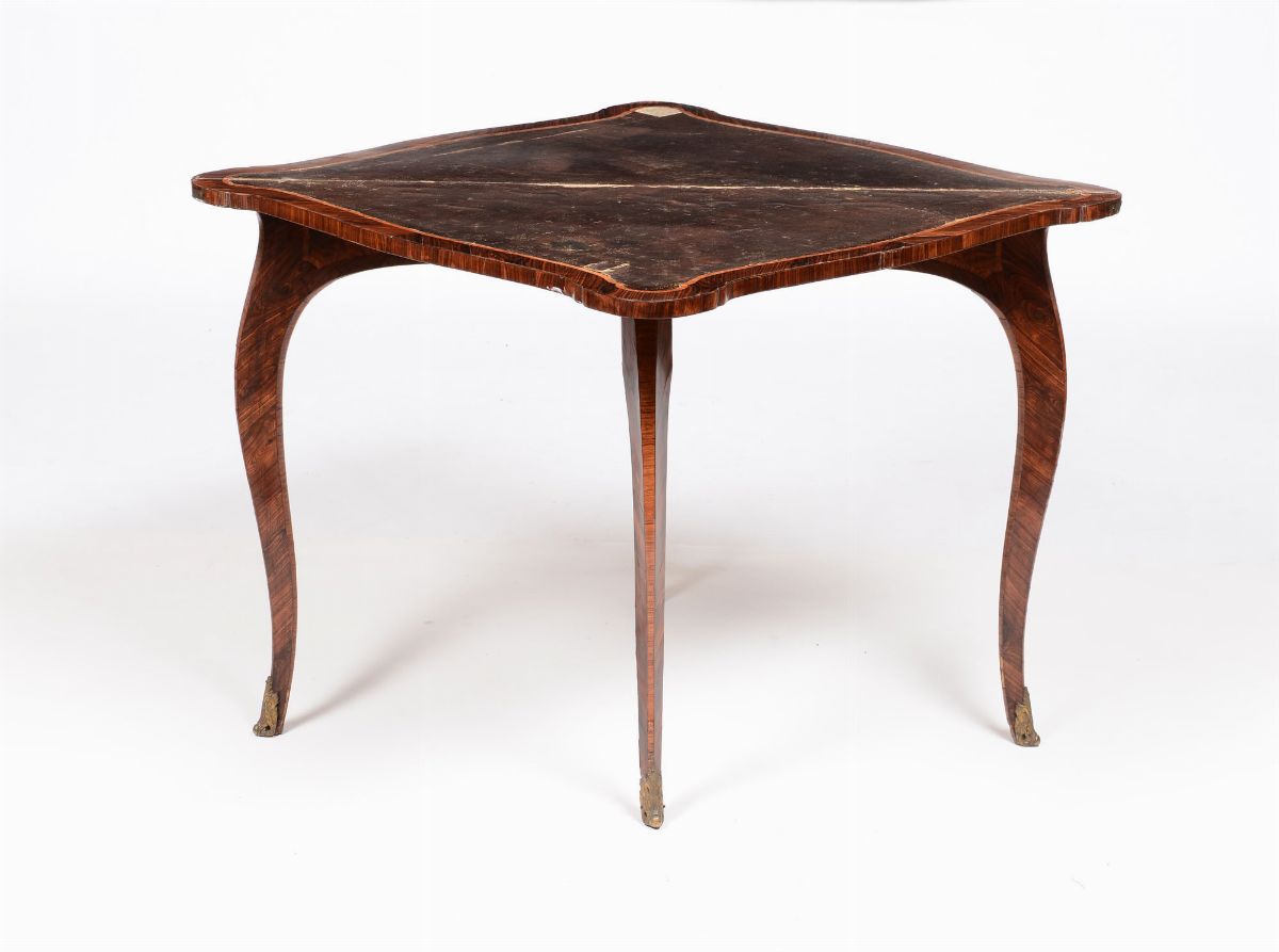 Tavolino da gioco a libro lastronato in palissandro e bois de rose. Genova XVIII secolo