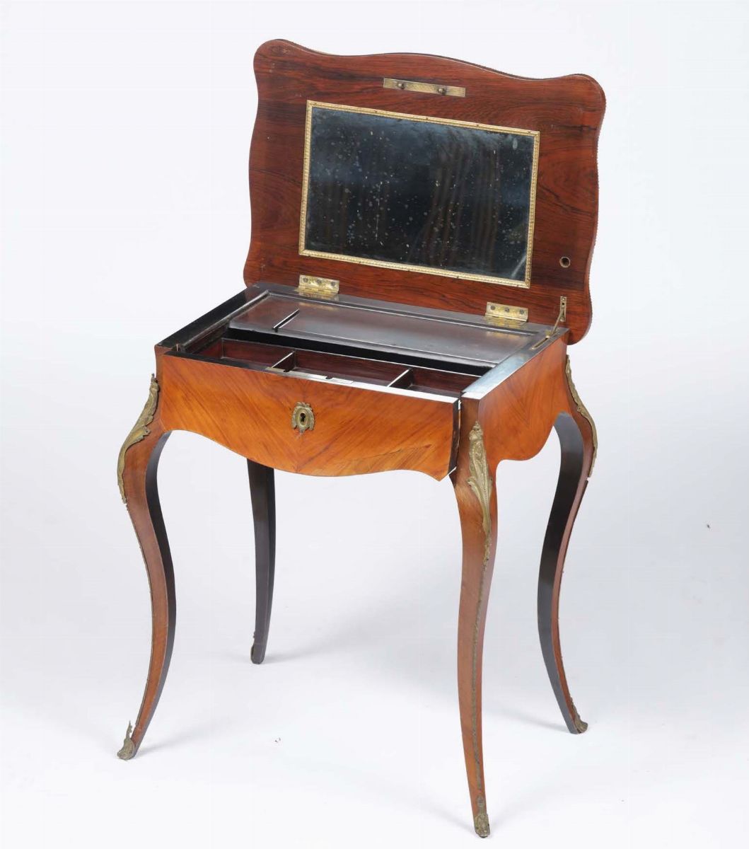 Tavolino da lavoro in legno lastronato in stile Luigi XV, XIX secolo
