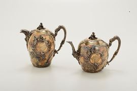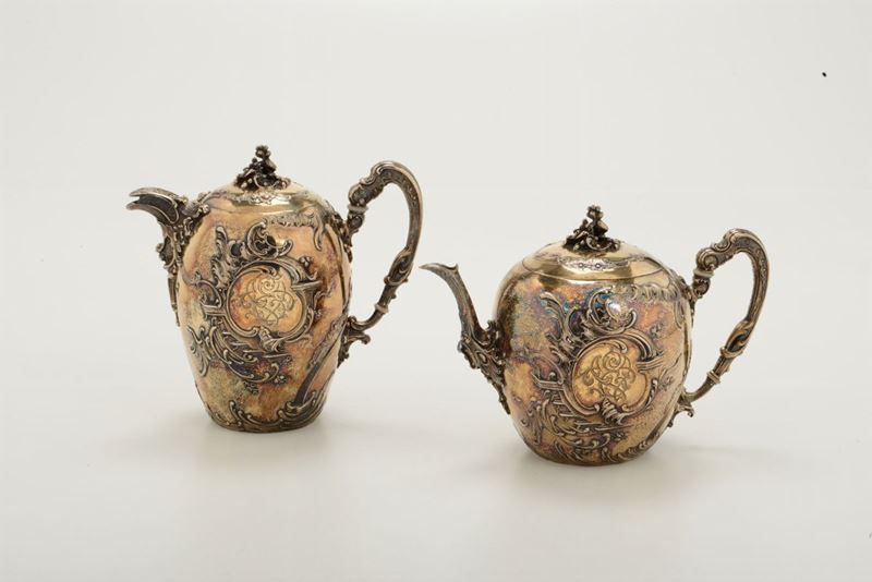 Teiera e caffettiera in argento fuso, sbalzato, cesellato e dorato. Manifattura del XX secolo