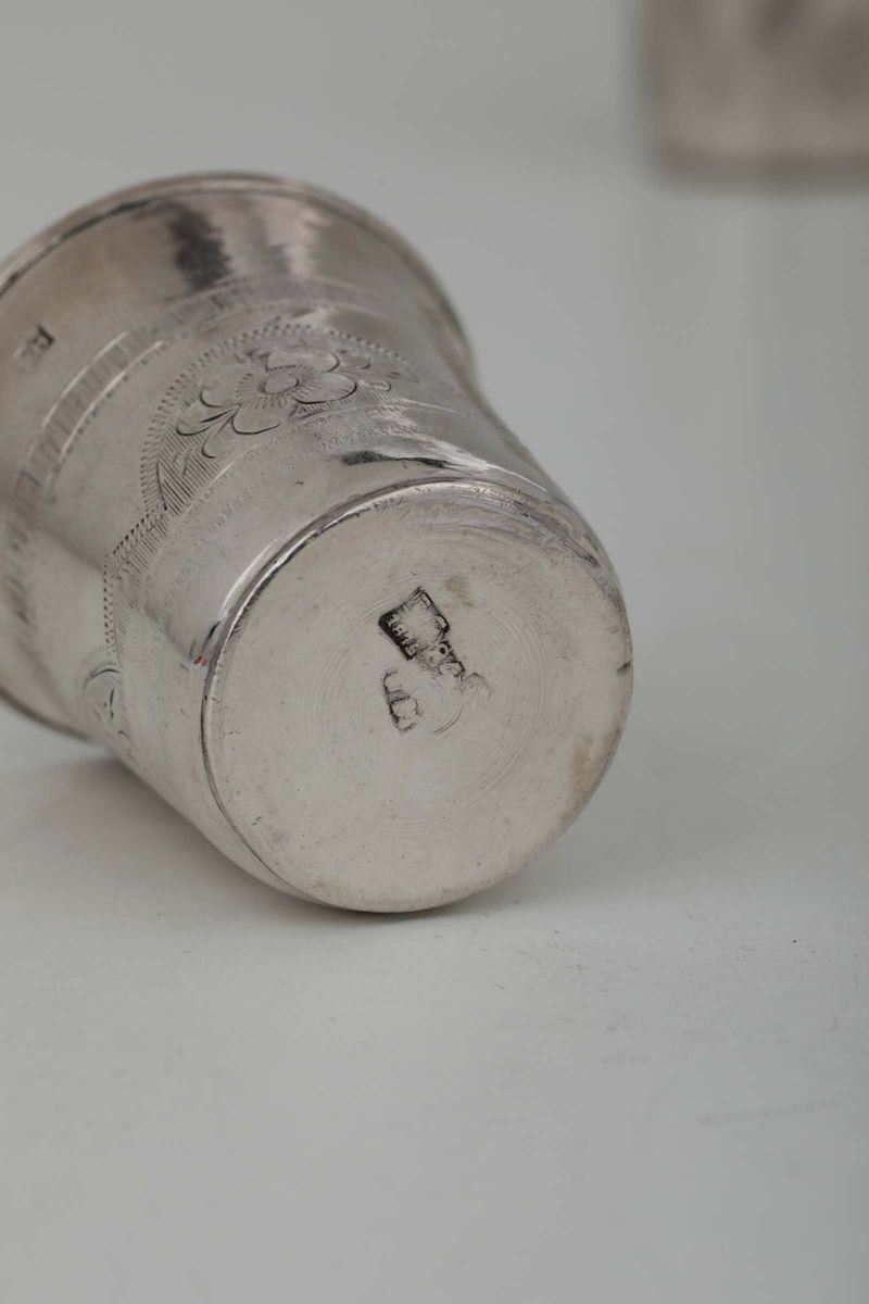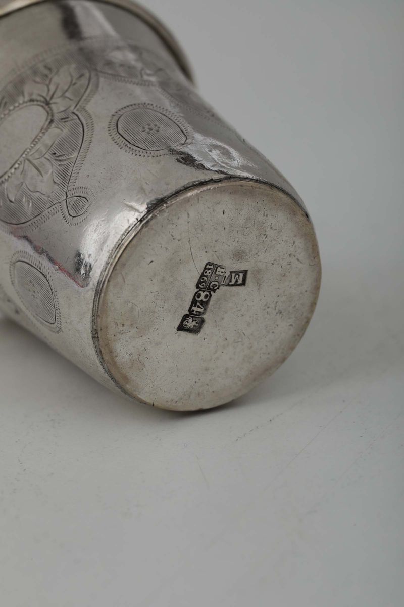 Two glasses in embossed and chiselled silver with floral motives. One Moscow 1875, one Moscow 1879