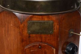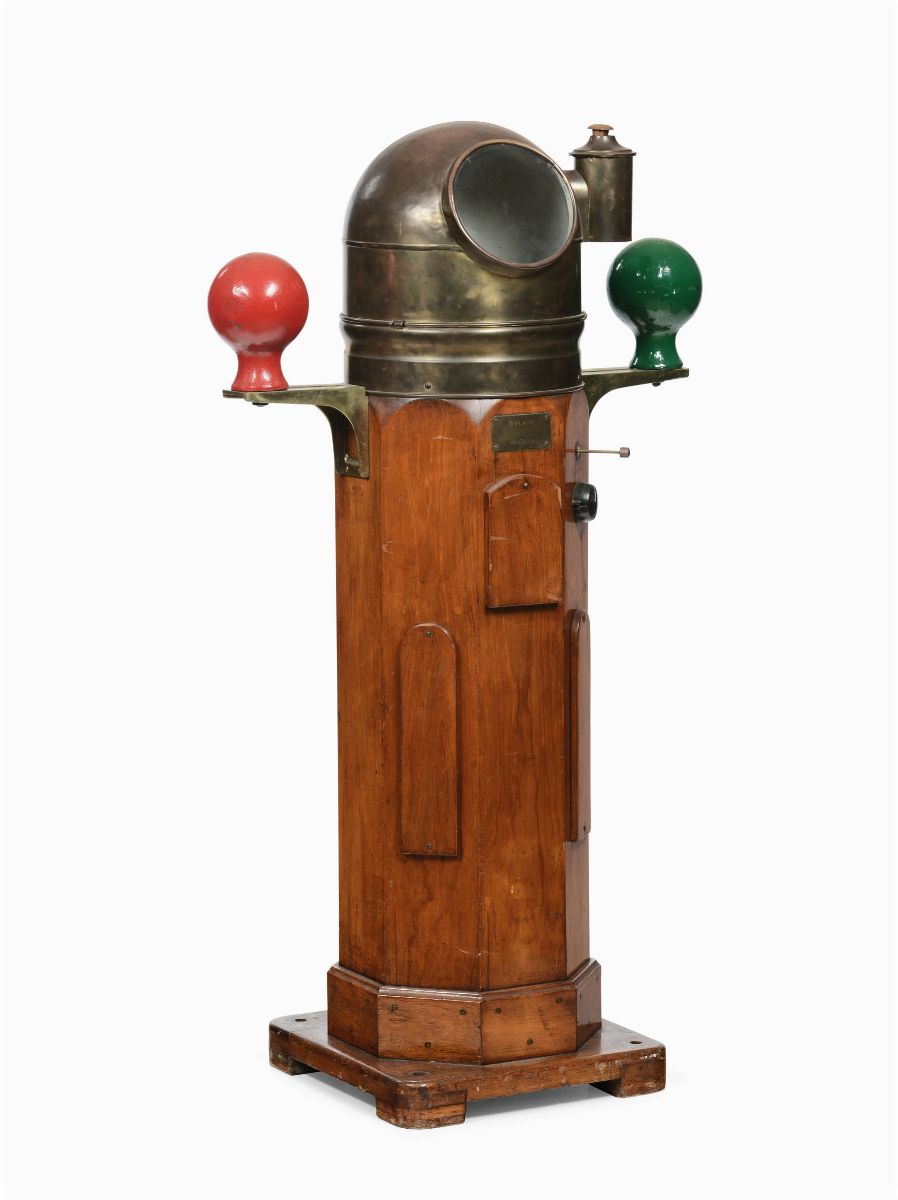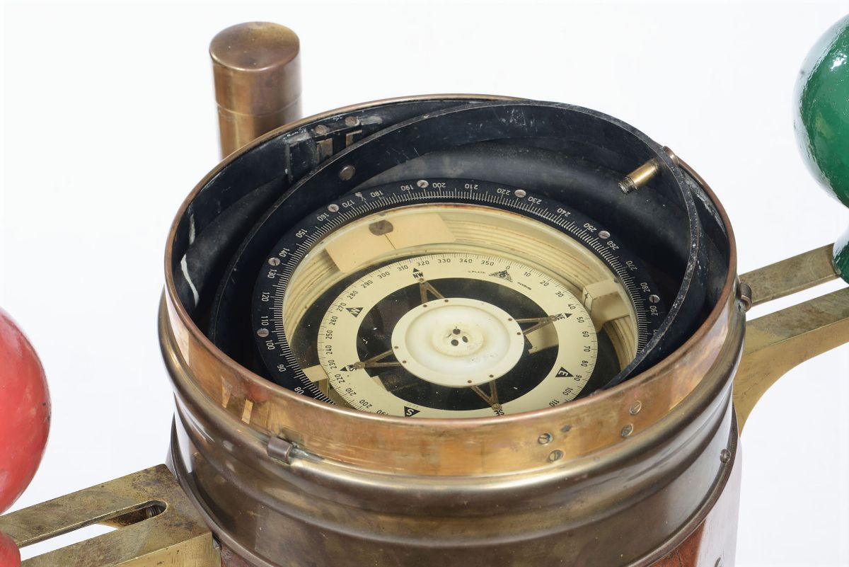 All’interno bussola a liquido a sospensione cardanica, armadietto ottagonale in teak, palle in ferro dolce su mensole in ottone, calotta semicircolare con oblò in vetro di lettura sul fronte, cm 80x47x146