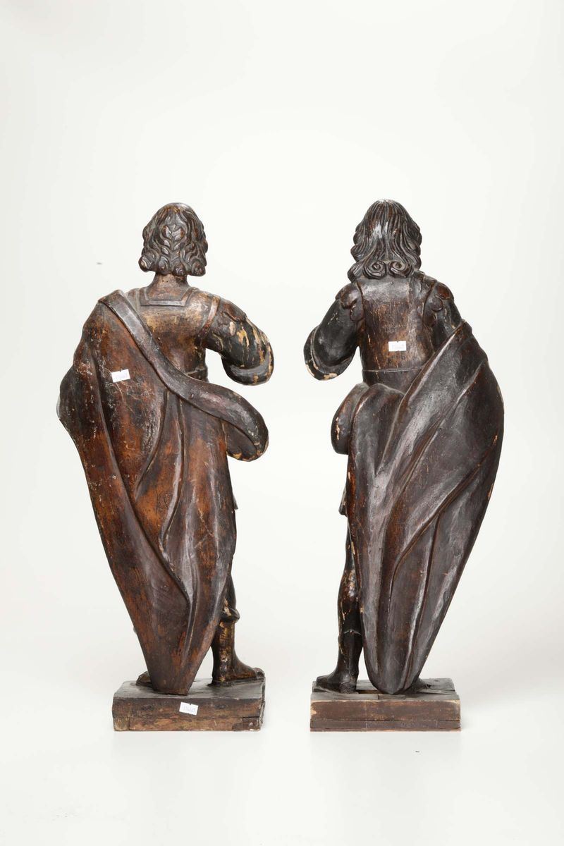 Coppia di sculture in legno intagliato, XVIII secolo