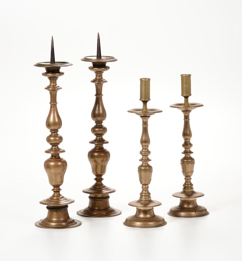 Due coppie di candelieri in metallo tornito, Toscana XVII-XVIII secolo