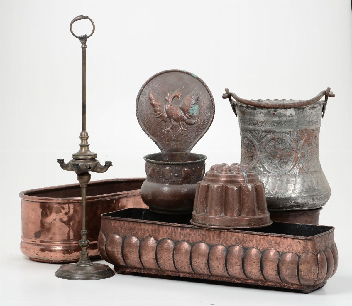 Lotto di oggetti in rame e lucerna in ottone