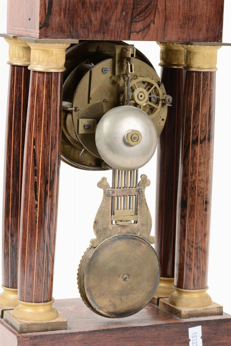 Orologio a tempietto in legno intarsiato di gusto Carlo X, XIX-XX secolo