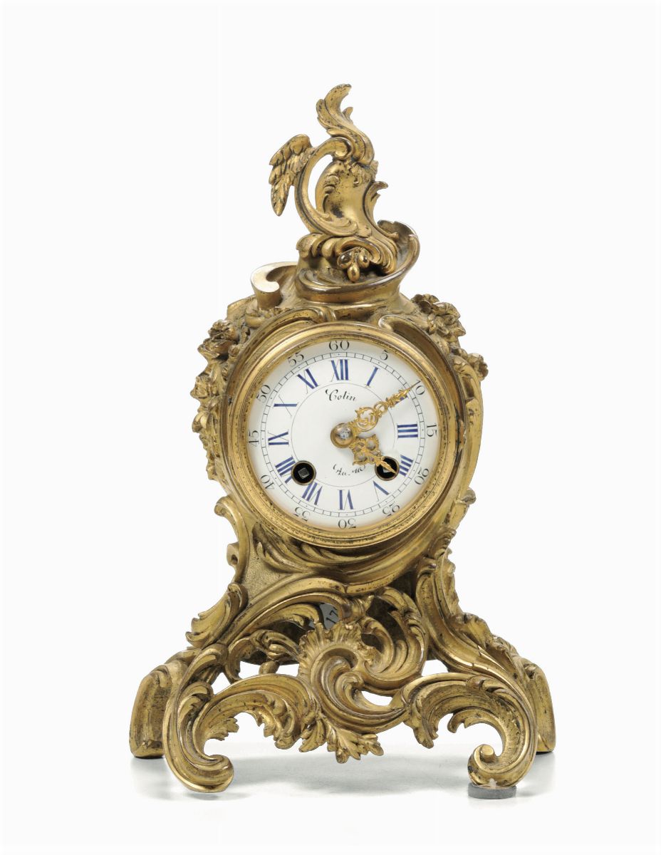 Cassa sagomata decorata a volute fogliacee, quadrante smaltato a numerazione romana per le ore e araba per la minuteria, firmato Colin, cm 16x10x25