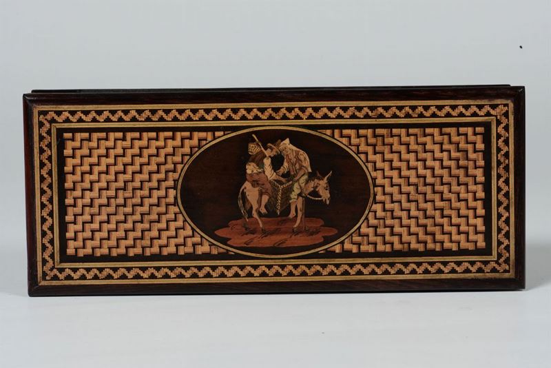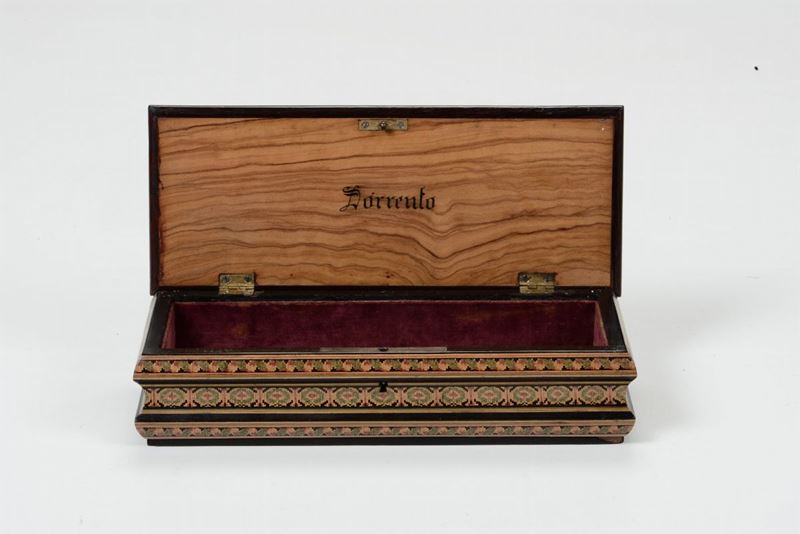 Piccola scatola sorrentina intarsiata in legni vari, inizio XX secolo