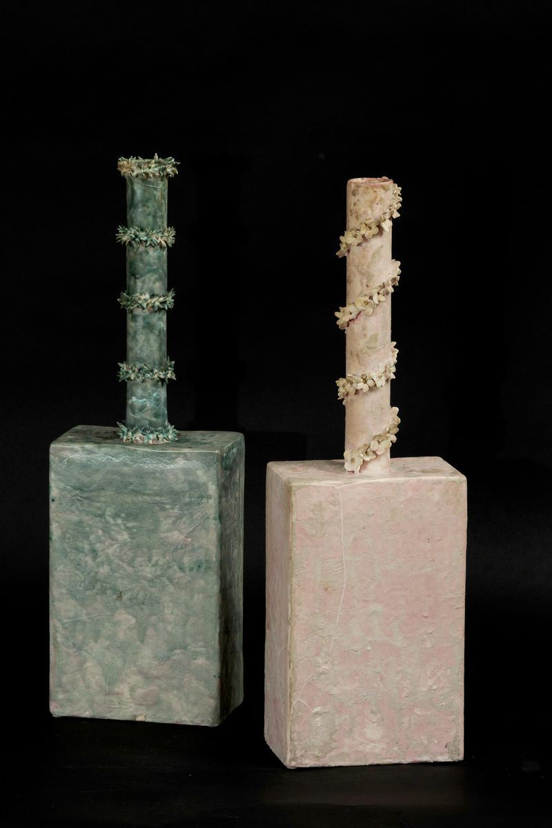 Vase in earthenware with high neck shaped with flowers festoon, decorated with green enamel