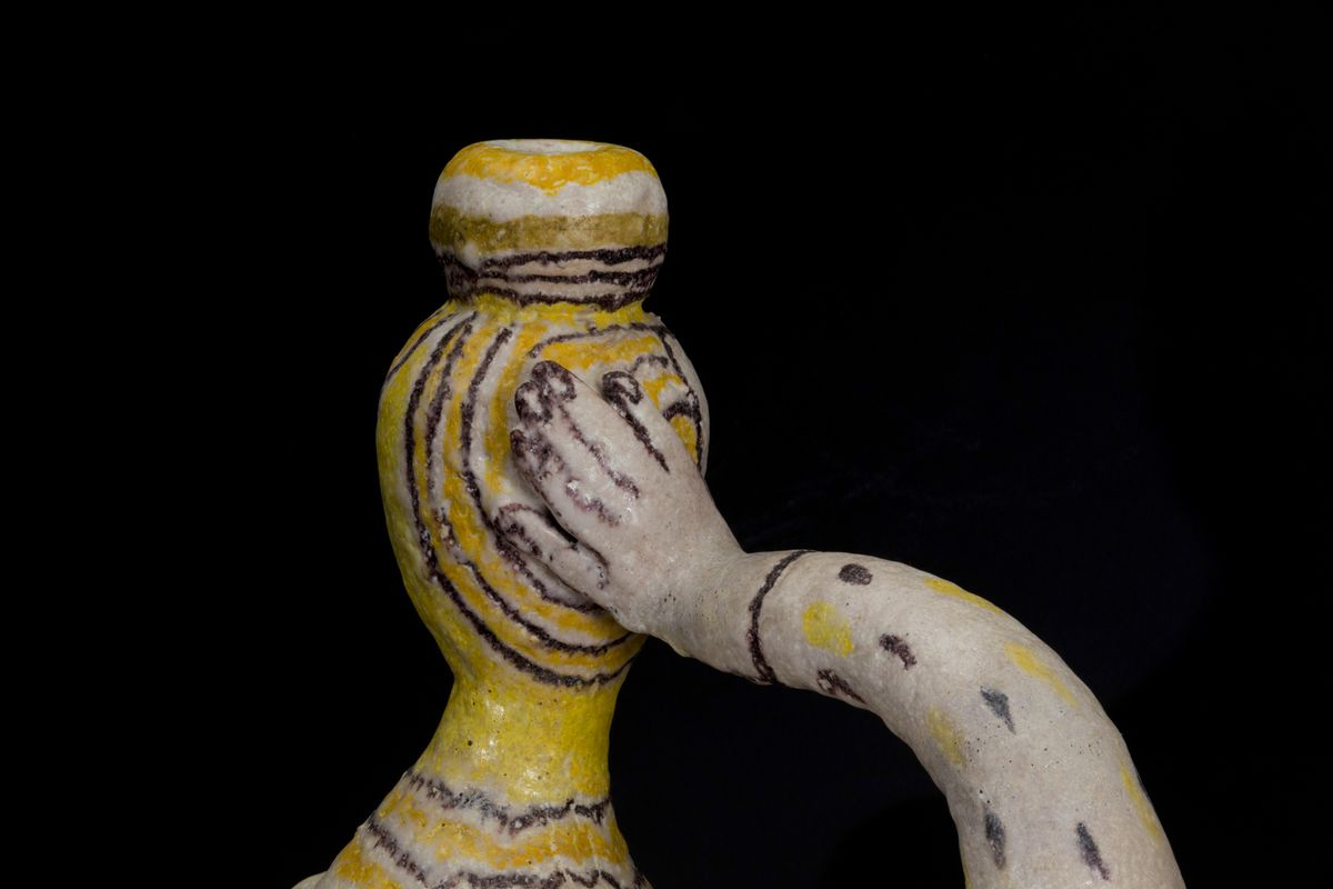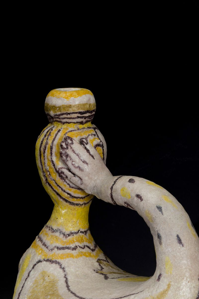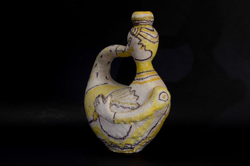Exceptional enamelled salt ceramic vase anthropomorphic with polychrome decoration