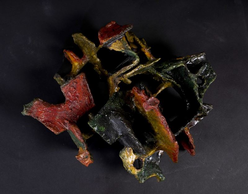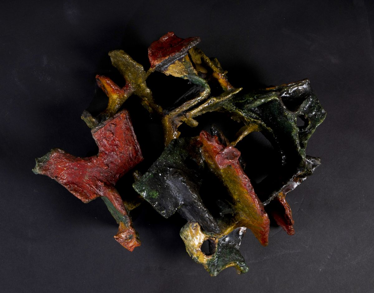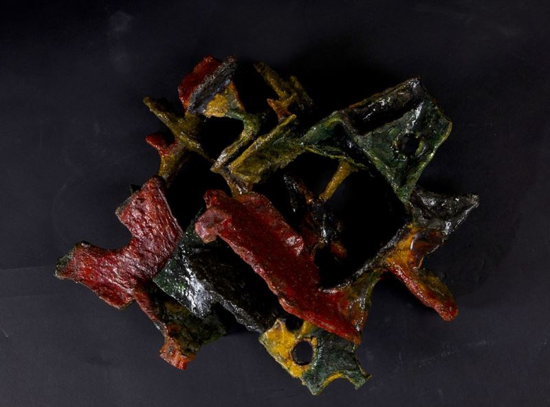 Wall sculpture in abstract polychrome ceramic.